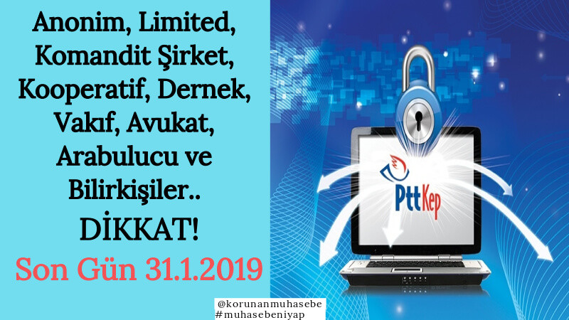 TÜZEL KİŞİLERE RESMİ TEBLİGATLAR ELEKTRONİK ORTAMDA YAPILACAKTIR.TÜZEL KİŞİLER 31.01.2019 TARİHİNE KADAR PTT’YE MÜRACAAT EDEREK SİSTEME KAYIT OLACAKTIR. "Elektronik Tebligat Yönetmeliği" 06/12/2018 Tarih ve 30617 Sayılı Resmi Gazete de yayımlanmıştır.Yönetmelik, 7201 Sayılı Tebligat Kanunu uyarınca aralarında mahkemelerin de bulunduğu tebligat çıkarmaya yetkili makam ve merciler tarafından PTT vasıtasıyla yapılacak elektronik...