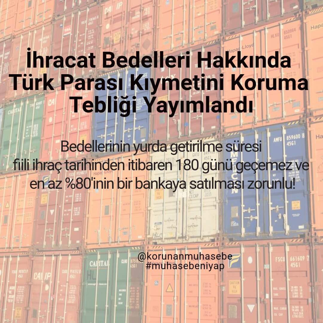 2018-32/48sayılı Türk Parası Kıymetini Koruma Hakkında 32 Sayılı Karara İlişkin Tebliğ (İhracat Bedelleri Hakkında) ile 4 Eylül 2018 tarihinden itibaren altı ay süre ile ihracat bedellerinin 180 gün içerisinde Türkiye’ye getirilme ve % 80’nın bankaya bozdurma zorunluluğu getirilmiş, daha sonra 3 Mart 2019 tarihli ve...