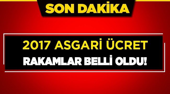 2017 yılı asgari ücret açıklandı. 2017 yılı yeni asgari ücret brüt 1.777,50 TL, net 1.404,06 TL olarak belirlendi. %8 'lık bir artış yapıldı. Çalışma Bakanı Mehmet Müezzinoğlu tarafından yapılan açıklamaya göre 01.01.2017 - 31.12.2017 tarihleri arasındaki asgari ücret brüt 1.777,50 TL TL, net 1.404,06 TL...