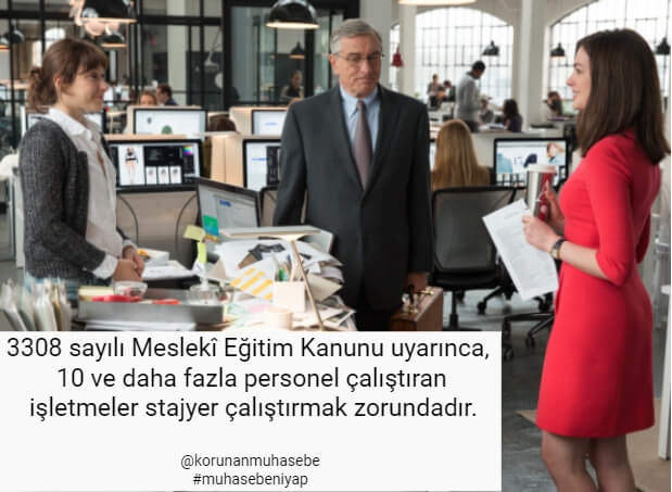 1-Stajyer Çalıştırma Zorunluluğu 3308 sayılı Mesleki Eğitim Kanununun 18 inci maddesinde yer alan hüküm gereği 10 ve daha fazla personel çalıştıran işletmeler, çalıştırdıkları personel sayısının %5’inden az olmamak üzere mesleki ve teknik eğitim okul ve kurumu öğrencilerine beceri eğitimi, mesleki ve teknik ortaöğretim okul ve kurumu...
